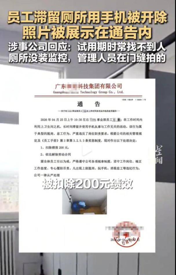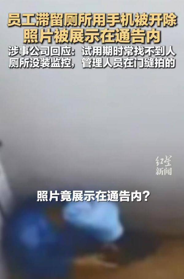 近日,广东珠海一家科技公司因试用期员工在厕所玩手机将其辞退,公司还将其如厕玩手机的照片附在开除通告中群发至400余人的员工群。